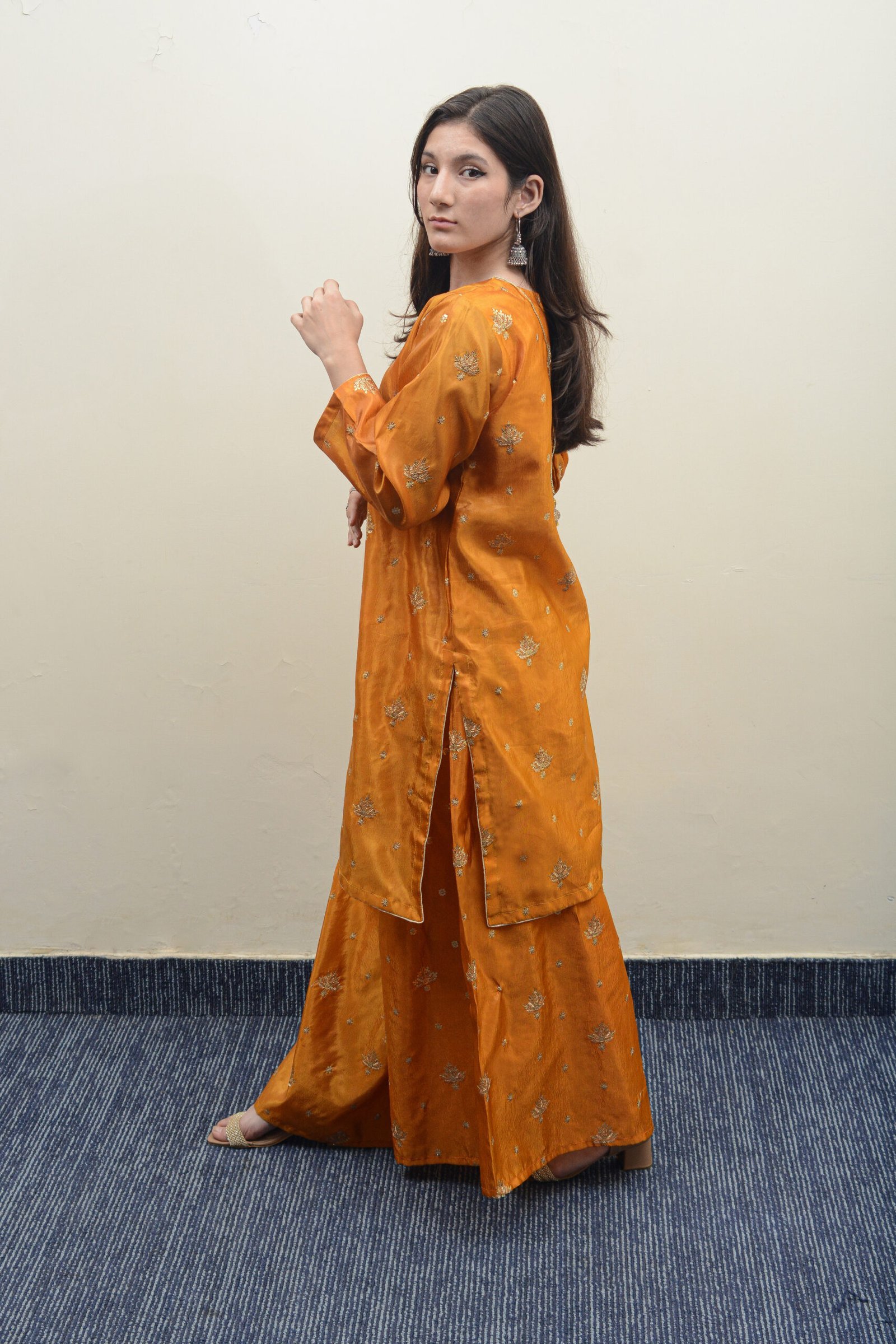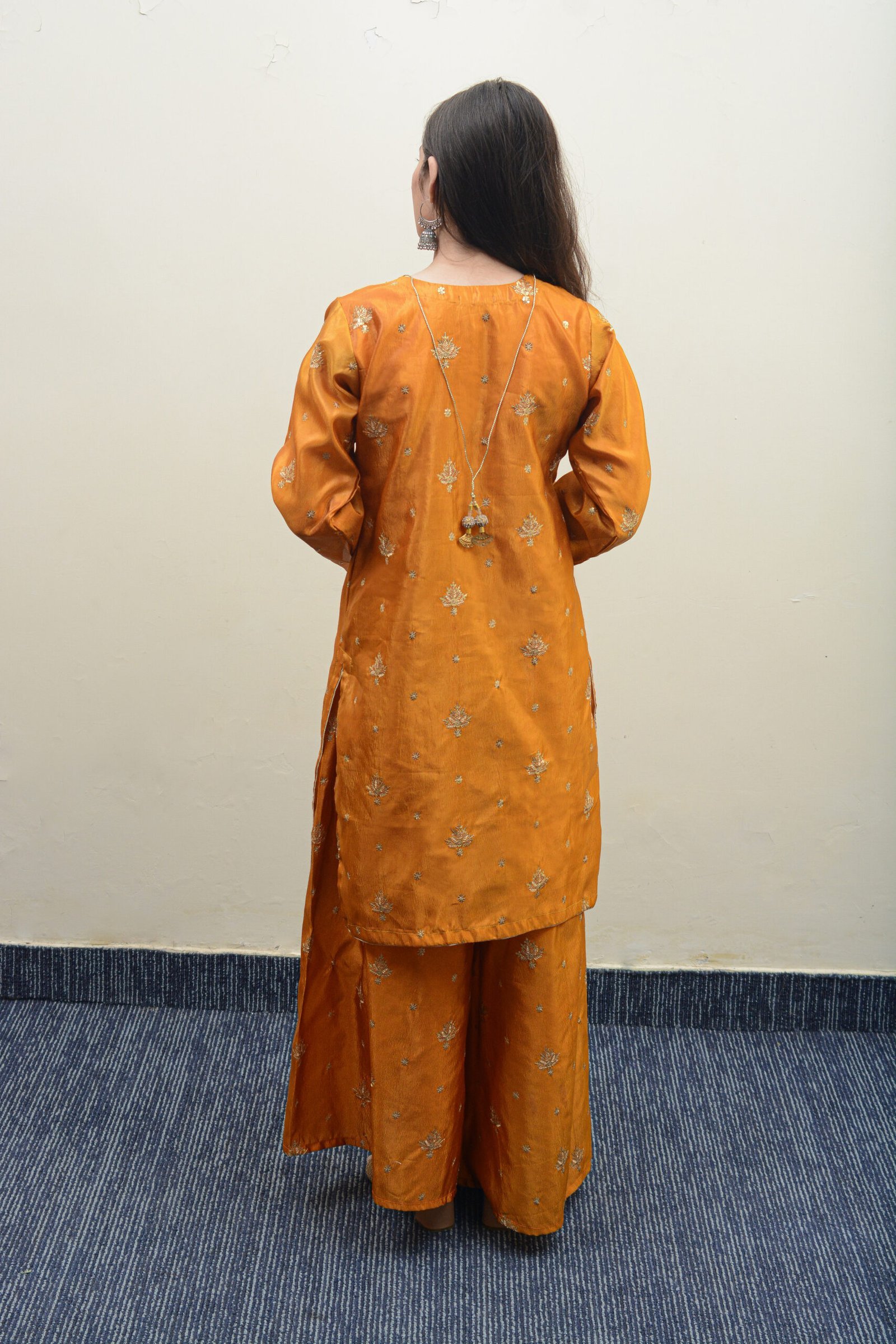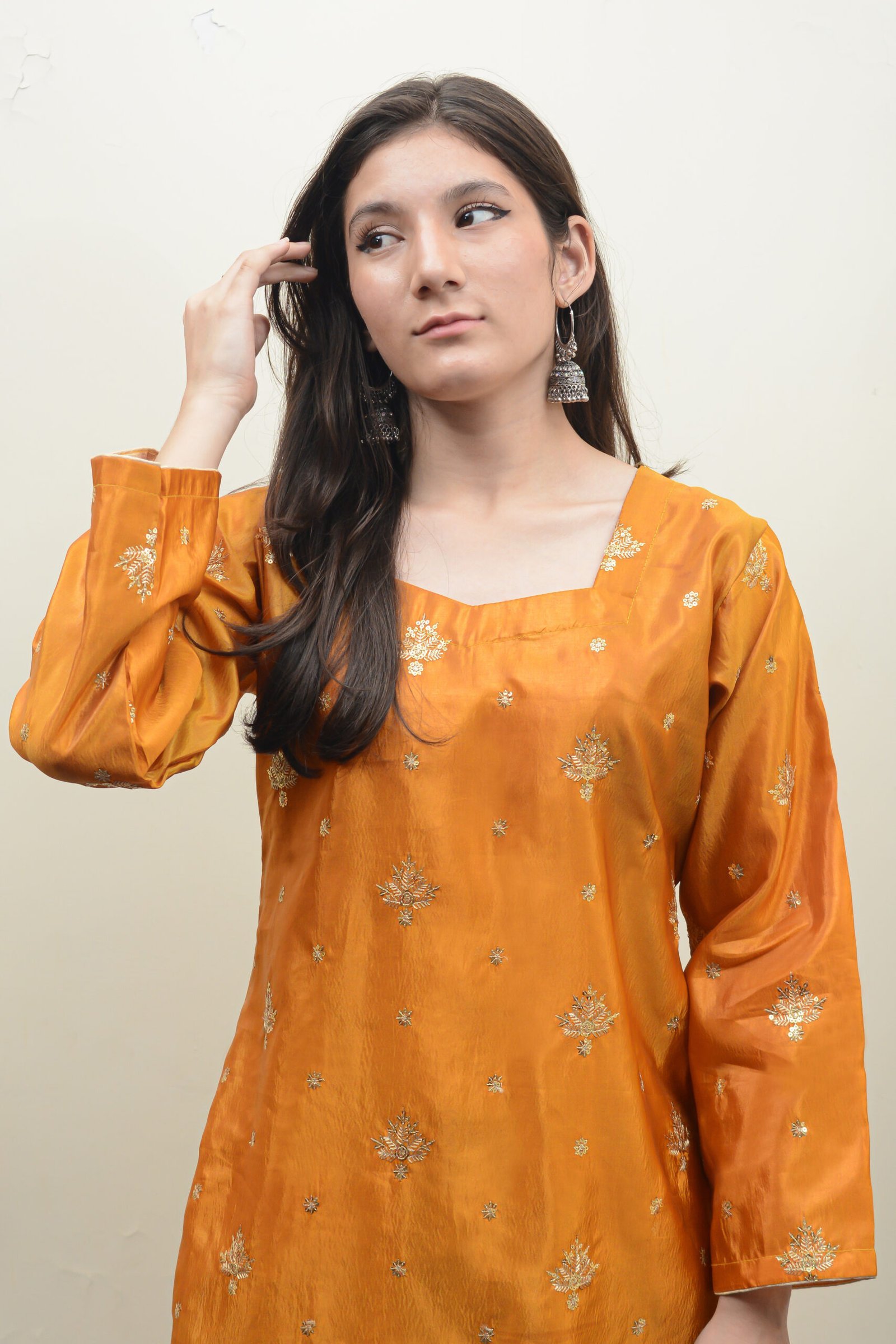 Design: Traditional shalwar kameez with an elegant gold floral embroidery pattern.