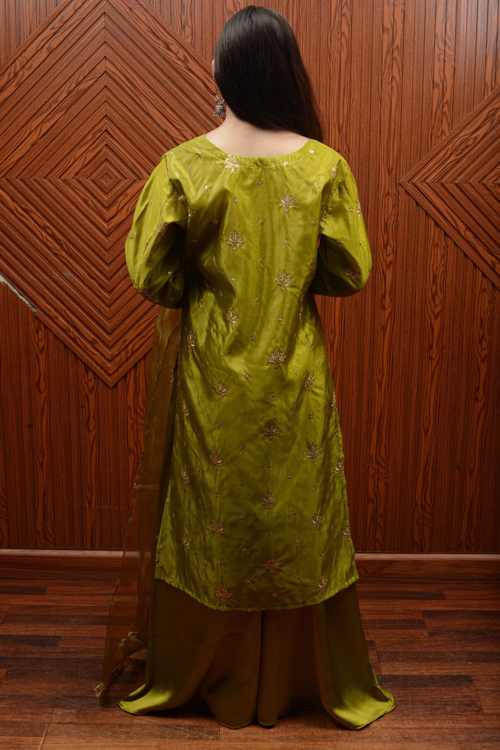 Elegant Green Katan Silk Tunic with Embroidered Detailing – Perfect for Special Occasions