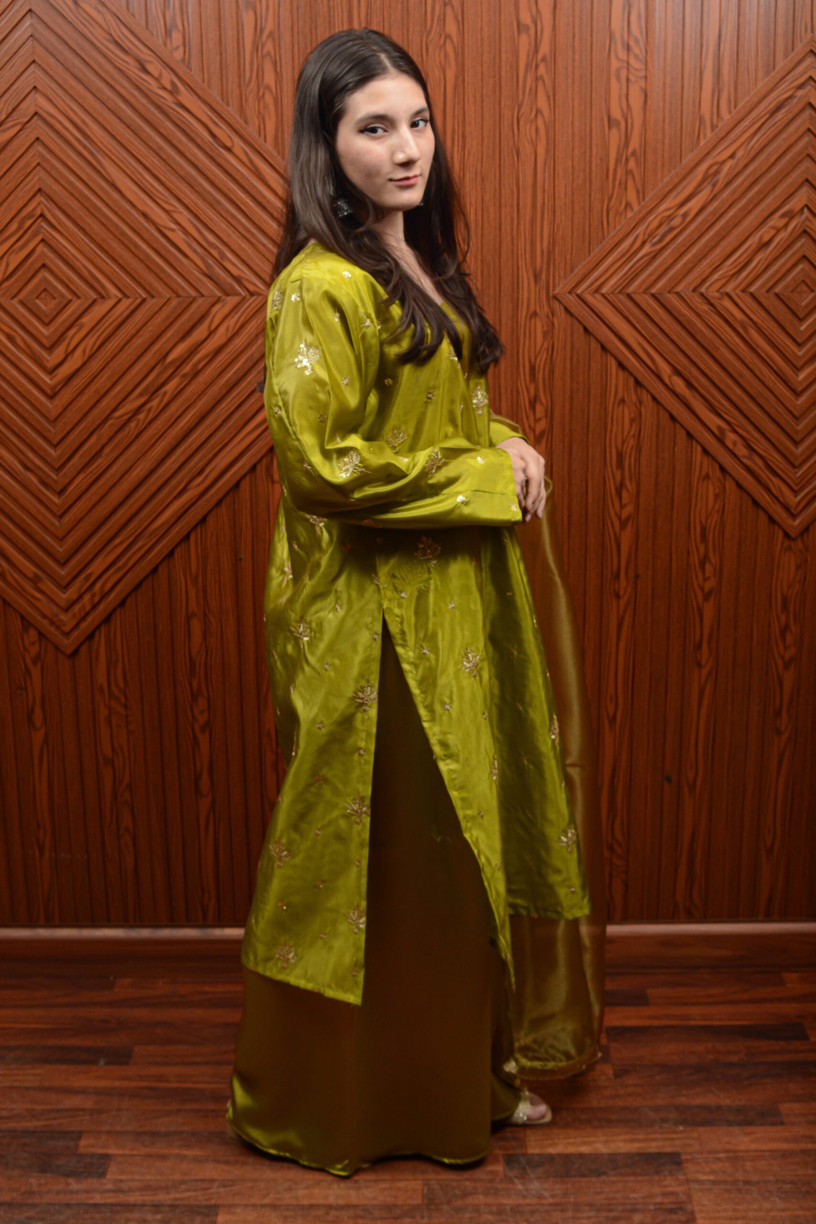 This green Katan Silk ensemble will bring elegance and charm to any special occasion. Order now on Libas-e-Haya and elevate your festive wardrobe.