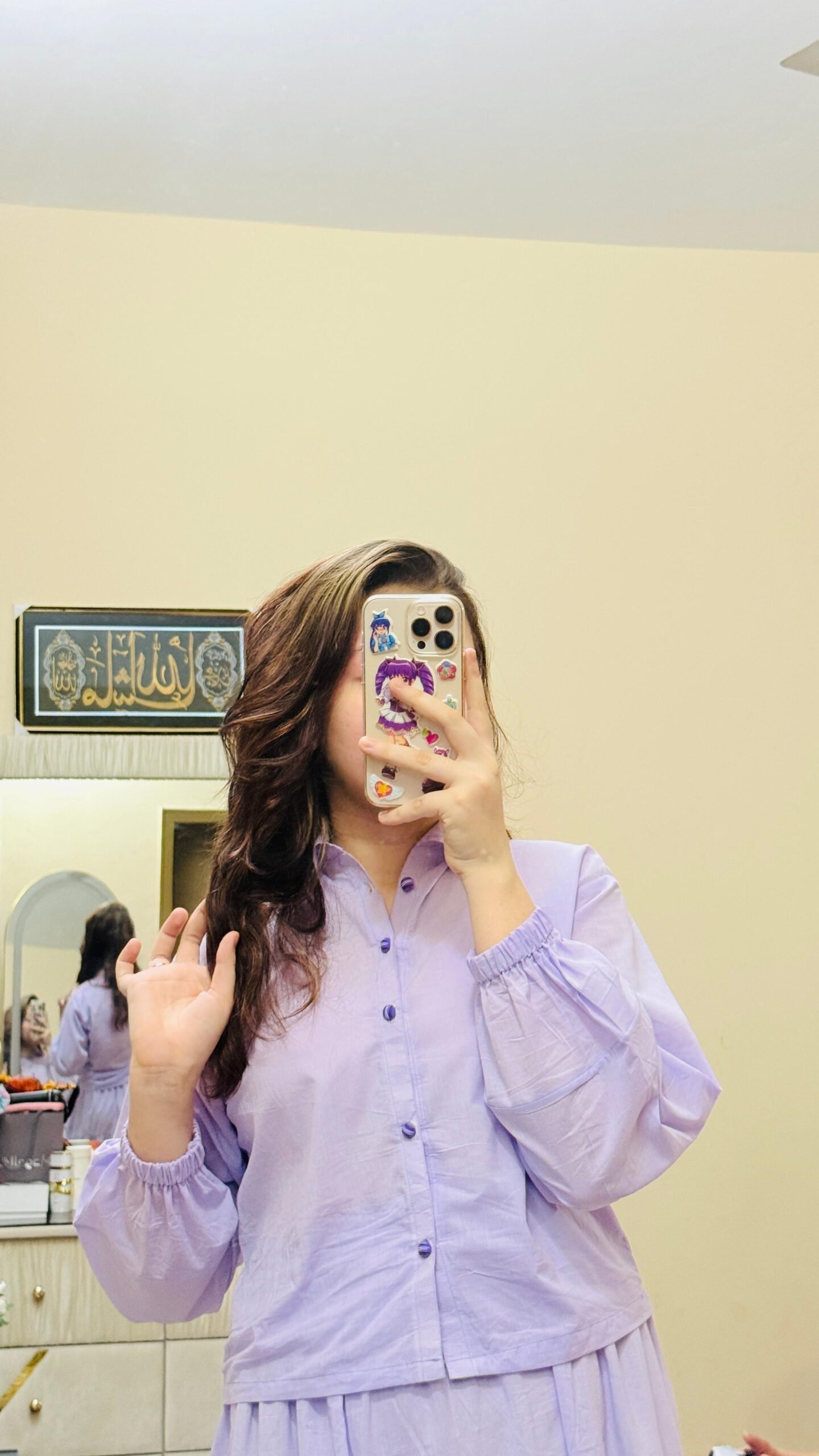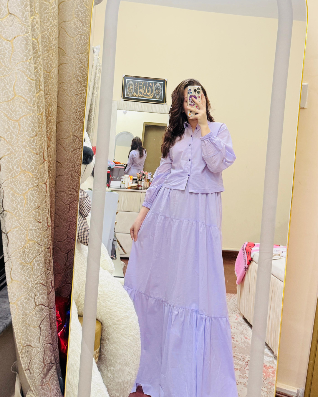 Bring charm and elegance to your wardrobe with this lavender maxi shirt & skirt set – a stylish blend of simplicity and grace. The soft lavender shade with button-down shirt and flowy layered skirt makes it a perfect outfit for everyday wear, brunches, festive events, and parties.