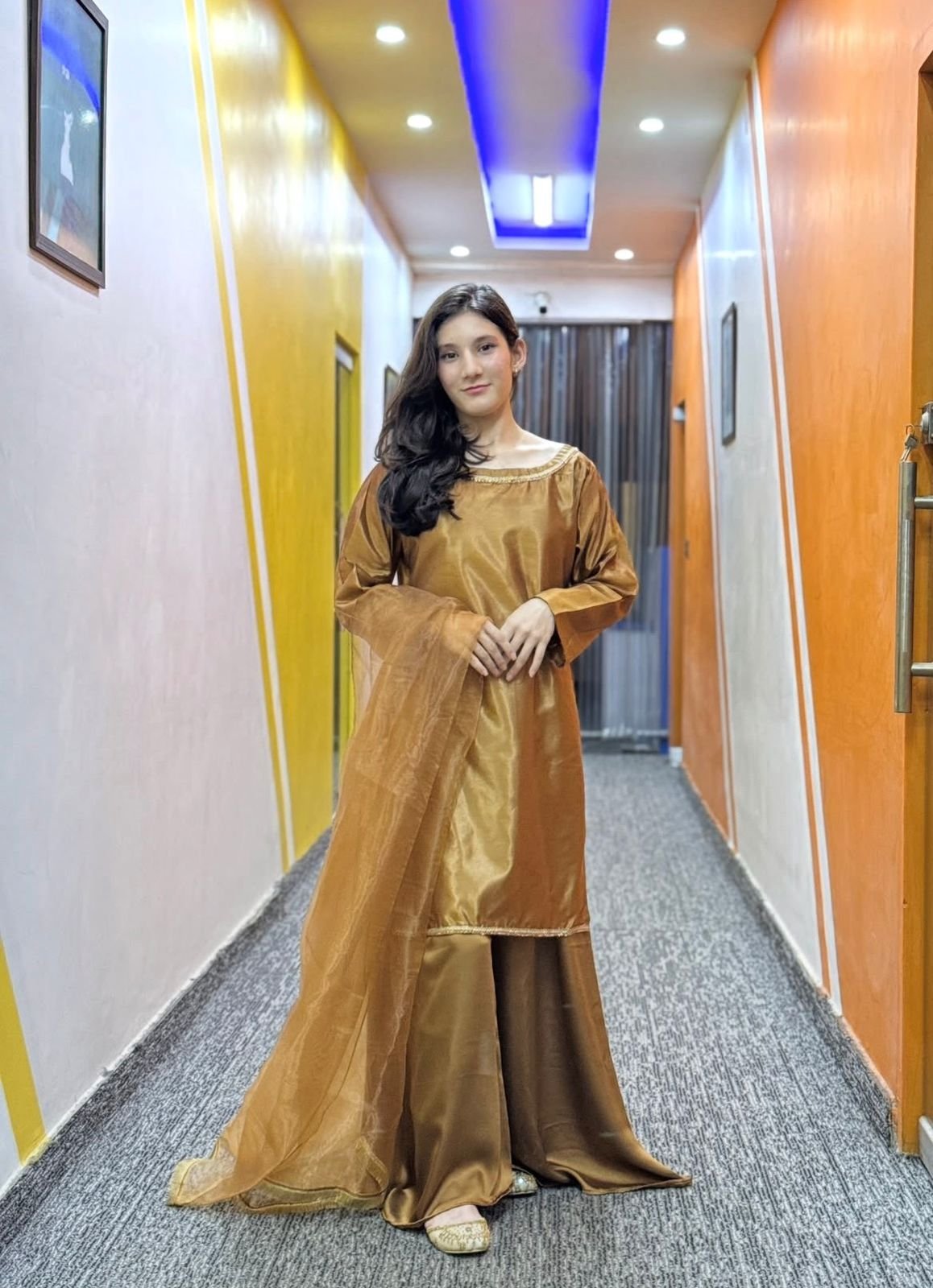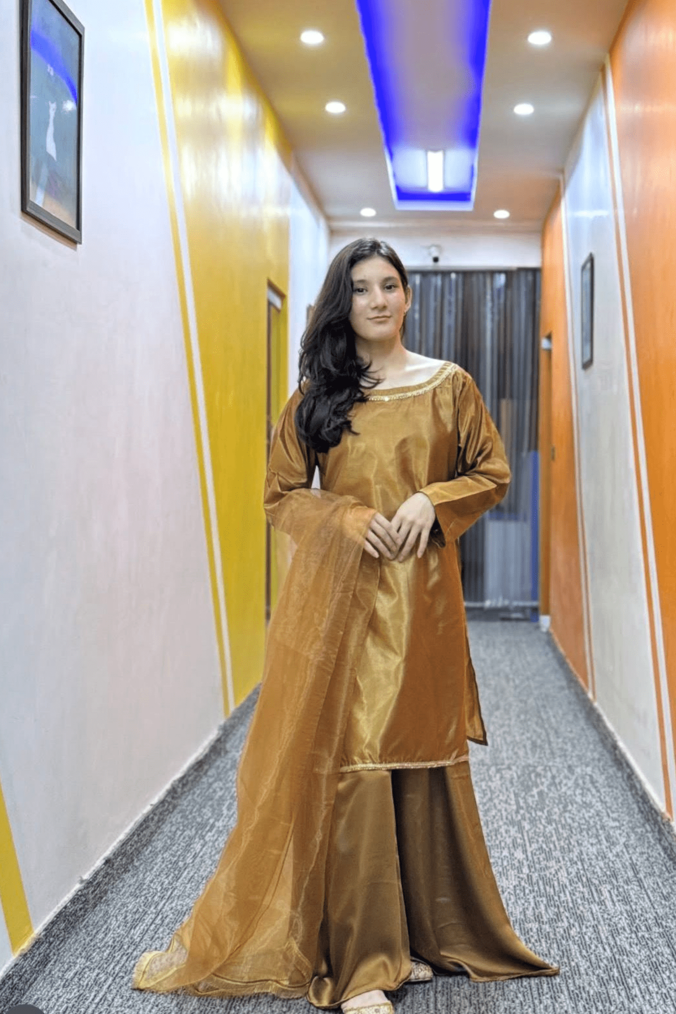 Step into elegance with our Golden Silk 3-Piece Suit, designed for girls who love a classy and effortless festive look. The outfit features a soft silk straight long shirt, flowy wide-leg trouser, and a lightweight organza dupatta, making it perfect for Eid, family events, Mehndi, and formal gatherings.