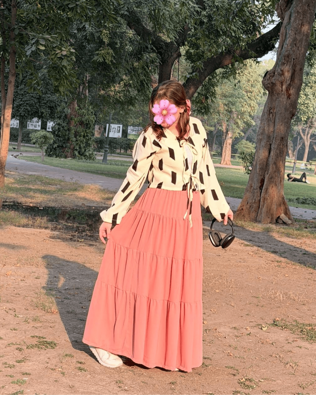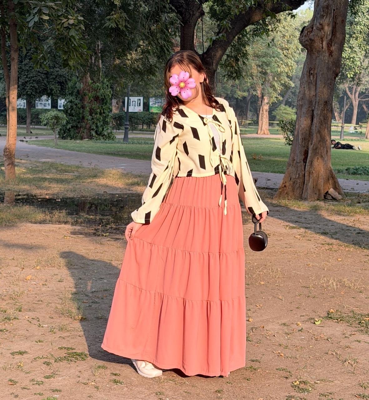 This outfit beautifully balances comfort, modesty, and style. The peach skirt adds a soft feminine charm, while the abstract print top gives it a trendy edge. Pair it with minimal accessories and comfy footwear for a look that feels effortlessly elegant and uniquely you.