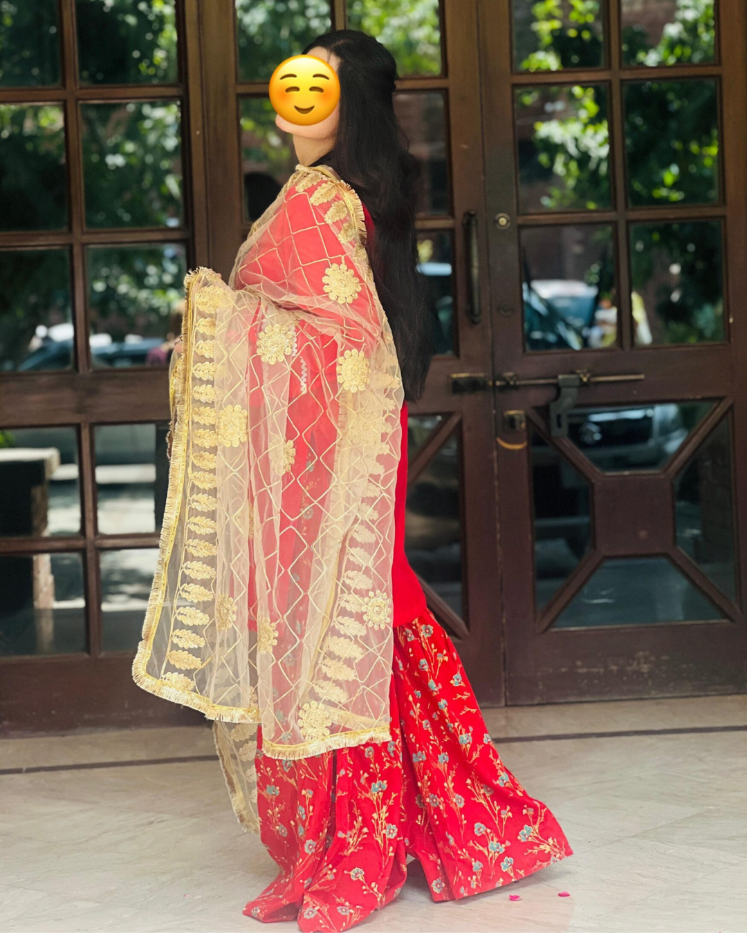 red muticolour Sharaara with Golden embroidery Duptta