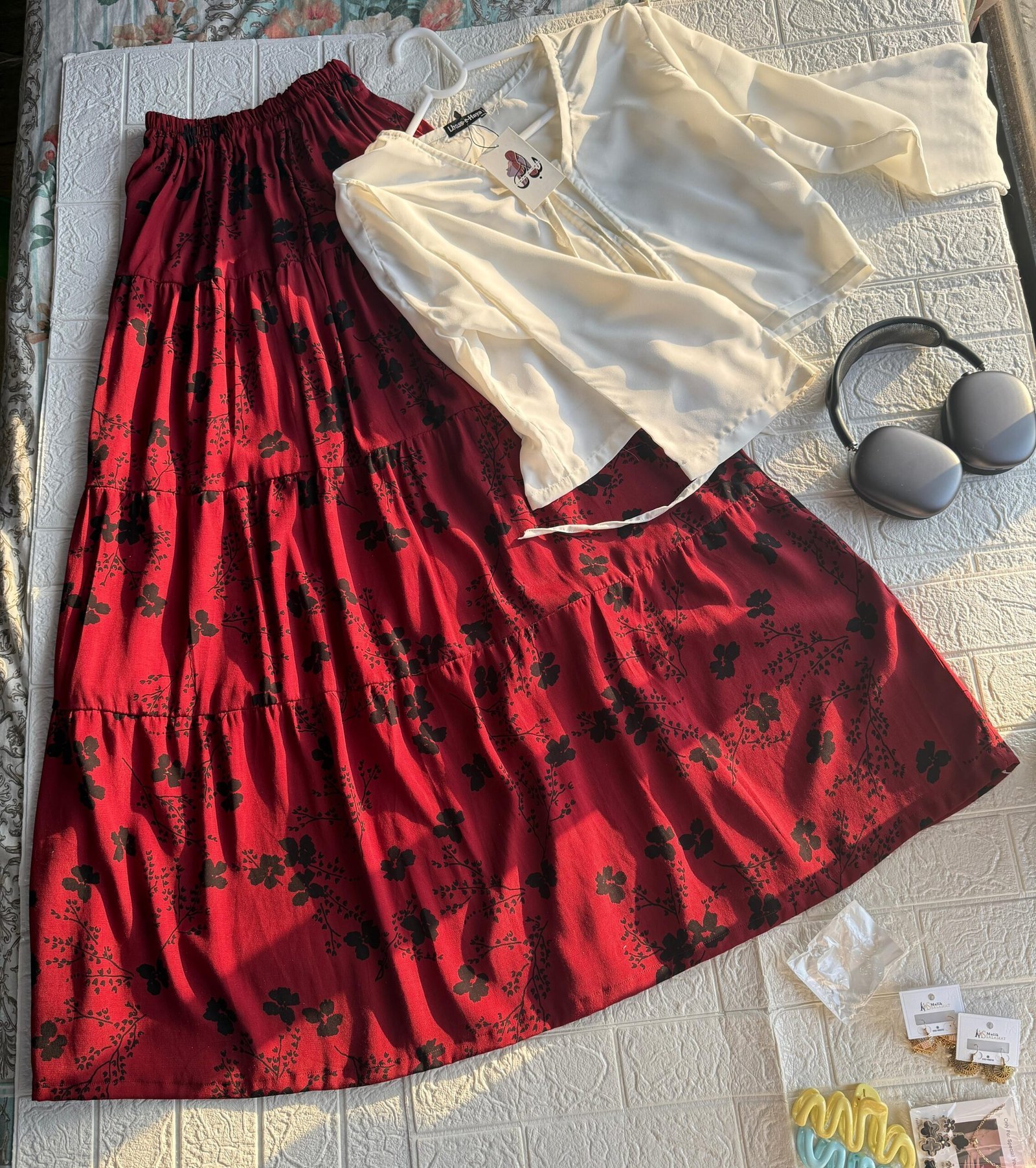 2-piece set: White tie-front shirt + Maroon floral maxi skirt